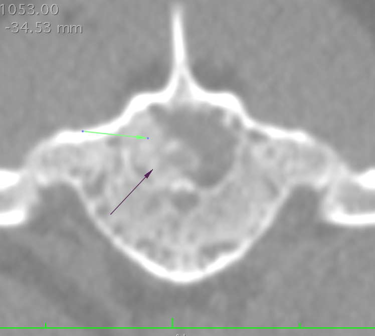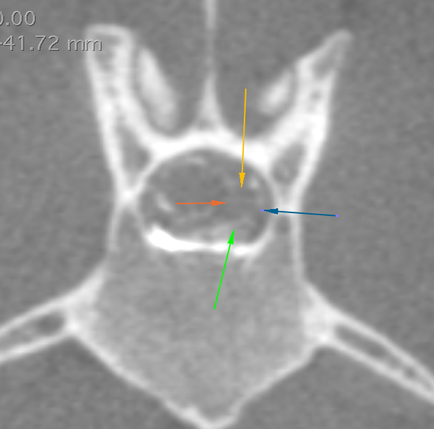 Above images are from a dog with a spinal tumor. The mass was not visible on a plain CT, however is very clear after a myelogram was performed. The arrows denote the mass location. The very white material is the contrast placed in the spinal cord CSF.