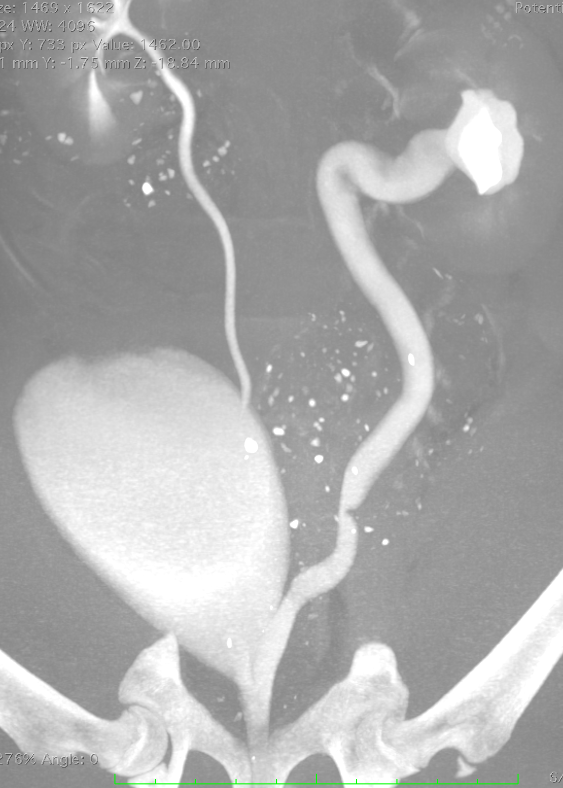 Ectopic ureter study - note the enlarged ectopic ureter to image right compared to the normal ureter on image left.